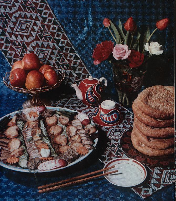 Uighur cuisine synthesises influences of the west and east, antiquity and the present, great skill, imagination, beauty and harmony of taste. The Uyghur Region of P.R.C has the highest longevity rate in China. 25% of its population lives over a hundred years. In October,1985, the area was listed as The World Longevity Area by the International Natural Medical Science Commitee in Tokyo, Japan. The reasons for the high longevity in the area seem to be related to the region's weather, environment, and people's life habits and physical quality. Yet it is also directly because of their cuisine. Uighur food is characterized by meat - mutton, beef, camel, chicken, goose; vegetables - carrots, tomatoes, onions, peppers, eggplants, celeries etc.; dairy foods; and various fruits. Some popular Uighur dishes are briefly described below: Cold dishes: First course dishes: Längmän is the most favorite and popular dish of the Uighur cuisine. It includes long noodles prm.htepared from thin strings of dough stretched from thick wisps served with a sauce. Every Uighur meal has its symbolism. This meal is referred to as a dish of love. Love should last long as the noodles are. The Uighurs prepare four kinds of längmän sauce depending on seasons: In spring, the sauce is prepared from spring onions, jusäy sprouts, celery and radish; In summer, cucumbers, garlic sprouts, usun, short and long kidney bean, tomatoes, green & red pepper, eggplants, garlic, onions and spring onions are added to the sauce; In autumn, the sauce includes carrots, kohlrabi, and radish; In winter, the sauce is prepared from dried and pickled vegetables. Also, there are different kinds of längmän, which differ by way of cooking, thickness of noodles, kind of a flour, etc. In Kashgar, längmän is nicknamed "snakes". Manty (Dimsum like dish)[1], [2] is an dish whose symbolism relates to a dish of the dzhigits (brave men). Manty are cooked on steam in a special cookware, which consists of sieves inserted one into another and called qasqan, or a flat vessel, weaved from cane - jimbil. Manty, as well as ravioli - chö & ürä, are prepared from rolled out dough with a stuffing. The dish could be prepared in a variety of ways, with different kind of dough and ingredients of a stuffing. Dough used for manty could be both leavened and unleavened. The stuffing also could vary including gourd (squash), meat, onions, jüsäy, fig, clover, spring onions, quince, vegetables, etc. Polo: The Uighurs frequently cook polo - pilaf. In general, this dish is the meal of guests. For a plenty of people, polo is cooked by a þpäz, specially invited cook who takes care of preparing polo on weddings or commemoration services. Cooking polo requires deft skills. Ingredients are rice, meat, carrots and onions. Pretty often polo is dressed with garlic or raisins. Samsa[1], [2] is one of the most honoured ancient Uighur dishes. It is a patty filled with ground meat and onions, gourd (sqyash), vegetables and fruits. Samsa is cooked in a tono, a cone-shaped oven for baking bread or in a cauldron. Dough for samsa is kneaded depending on where it would be cooked. For example, for tono samsa, the dough has to be kneaded, and is salty and stiff; for samsa cooked in a cauldron, the dough could be flabby and yeasty. Pörä: A kind of fried meat pie, filled with herbs, jüsäy, clover, wheat sprouts, dill, cabbage, and coriander. The filling could be the chopped meat and onions. Göþ nan Bread patties filled with meat and onions, baked in a cauldron. Olouh nan Steam bread roll prepared with carrots, gourd, jüsäy, spring onions, etc. Breads[1], [2]: The Uighurs make bread from wheat flour, sometimes, from corn flour. Bread is usually baked in tono big ovens, from leavened or yeasty dough in form of a pita: large and thin çong nan, small and thick - toðaç. The Uighurs bake short puff pitas in a cauldron - qatlima from dough made on oil and cream as well as thin pancakes - po qal. On holidays people make various short pastries in a cauldron, in particular, sangza. Bread baked in tono is considered the most nutritious, because it absorbs the heat of the fire. There are more than 40 (forty) ways of making bread in Uighur cuisine. Tea occupies an important place in a diet of the Uighurs. Since the Silk Road passed through Uighur territories, tea has been known to them for considerable period of time. The Uighurs make tea in different ways and have their own tea rituals. References:The Uyghurs - Tripod siteUyghur Cuisine - Uygur World Amina Abdurahman, Western Illinois University |
